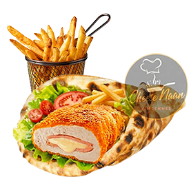 Cordon bleu, fromage, sauces, crudités. Servi avec frites +1 € pour une boisson 33cl au choix.