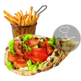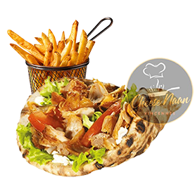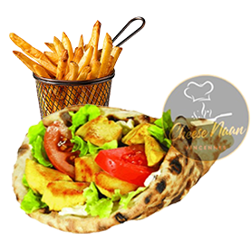 Kebab, sauces, crudités. Servi avec frites +1 € pour une boisson 33cl au choix.
