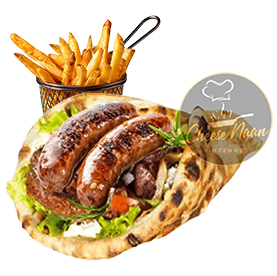 Merguez, sauces, crudités. Servi avec frites +1 € pour une boisson 33cl au choix.